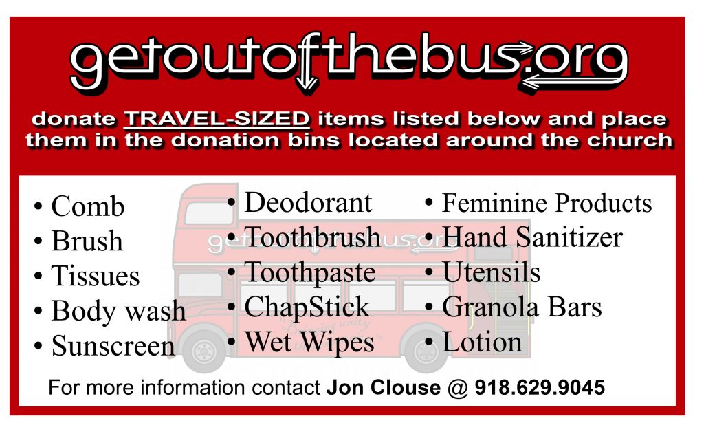 If you would like to volunteer, support, or get more information on Get Out of the Bus, call founder and AHBC church member, Jon Clouse at (918) 629-9045.